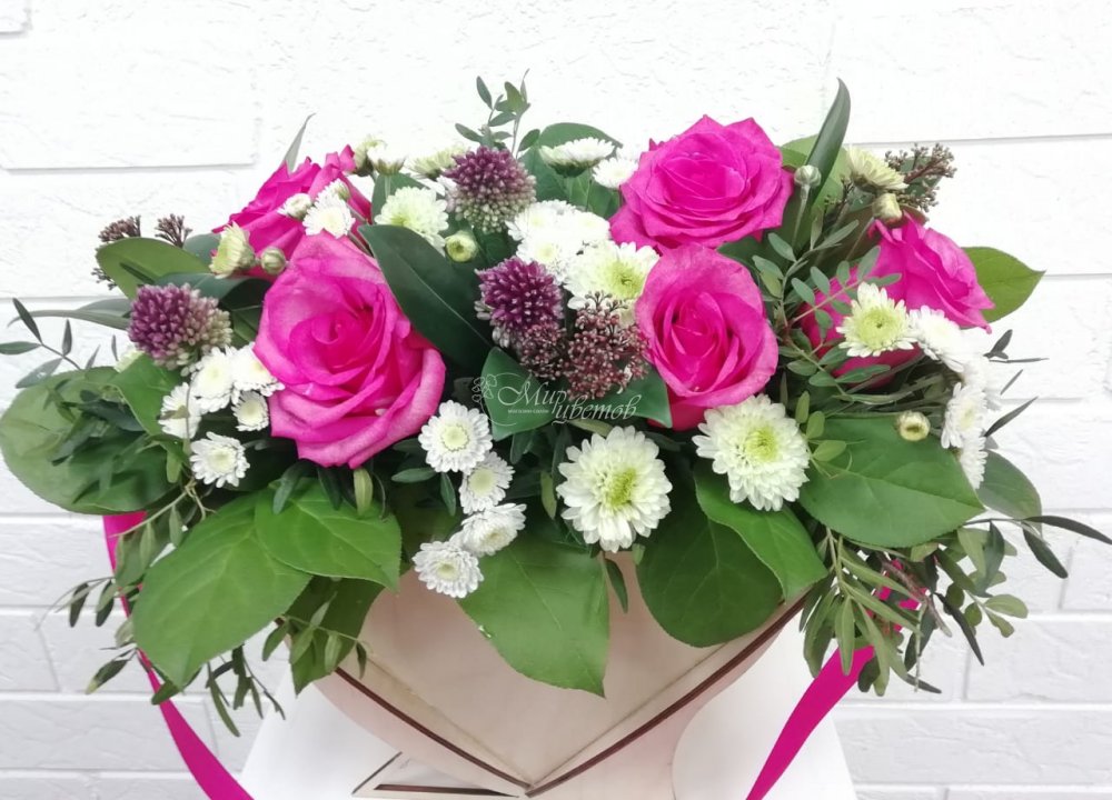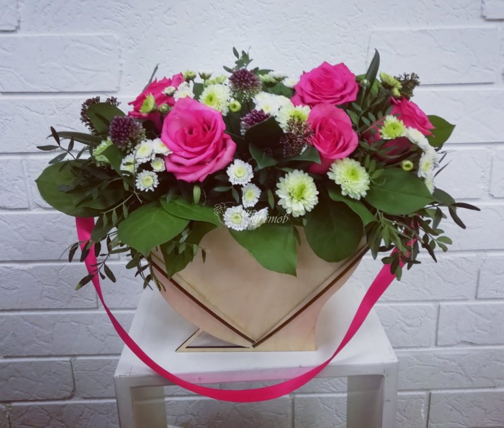 Кашпо "Сердце" Роза алиум Хризантема Скимия Зелень