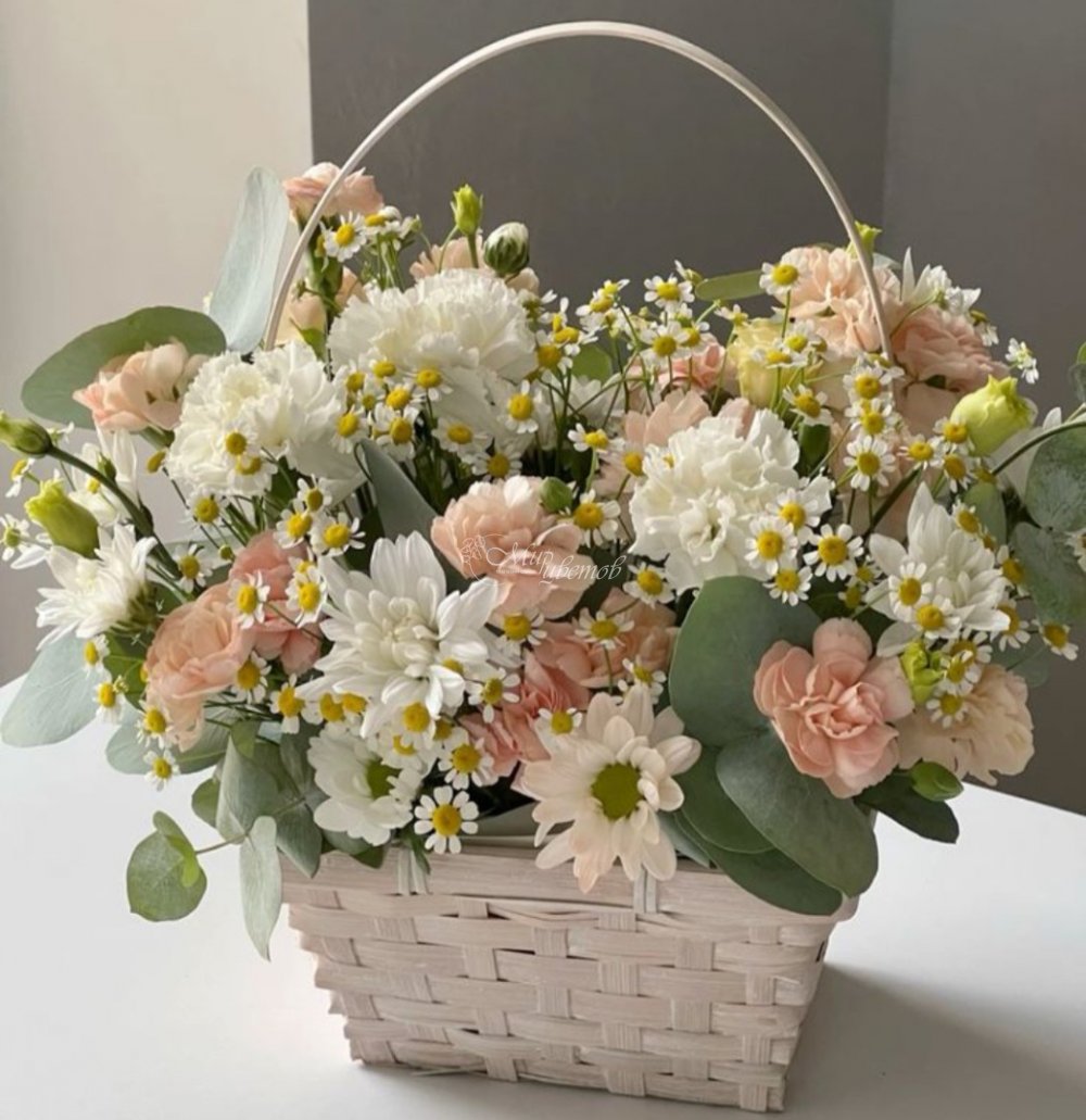 Корзина Зелень Гвоздика Хризантема кустовая Танацетум Эвкалипт