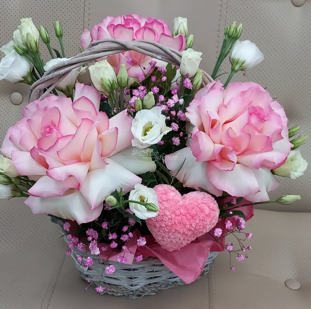 Корзина Роза Эустома Гипсофила Зелень Сердце декор