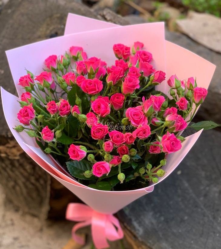 Роза красная - 3 шт Эустома - 3 шт Роза кустовая - 3 шт Хризантема кустовая - 3 шт Умбрела - 2 шт Салал Фатсия - 3 шт Упаковка фетр Лента атлас