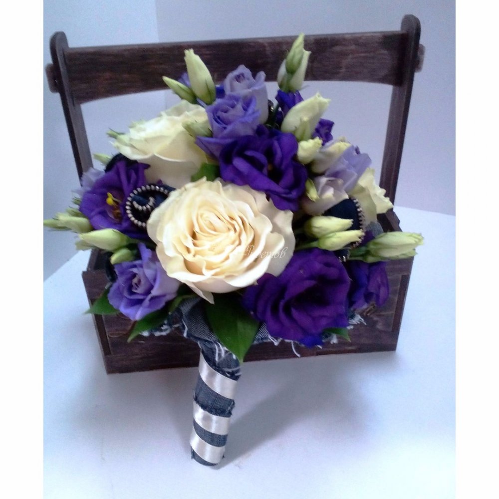 Роза белая Эустома фиолетовая Зелень Джинсовые акссесуары