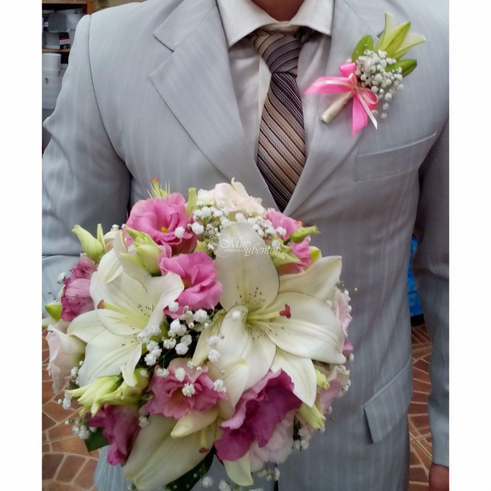 Лилия азиатка Эустома розовая Гипсофила Салал Лента атлас Бутоньерка