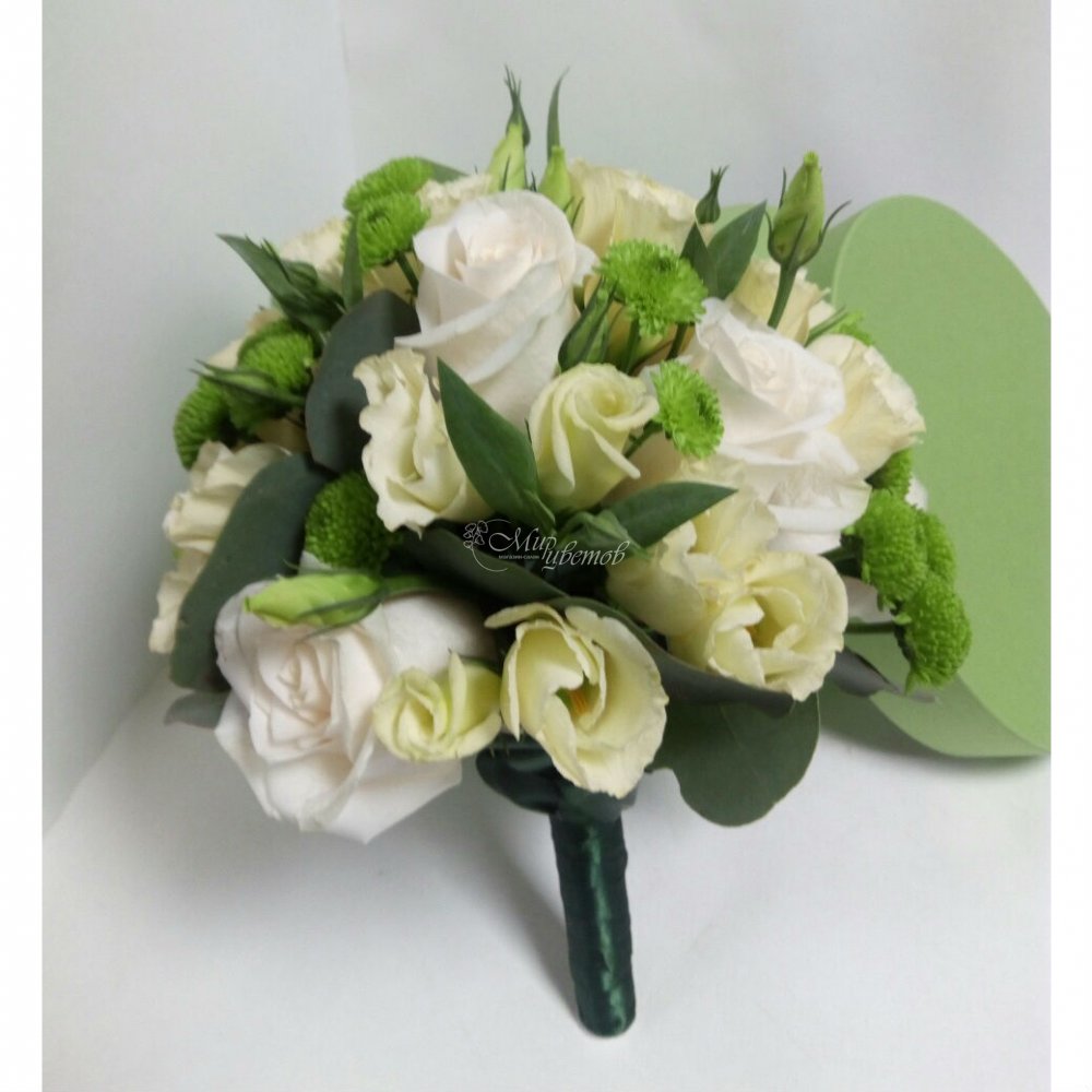 Роза белая Эустома Хризантема кустовая Эвкалипт Лента атлас