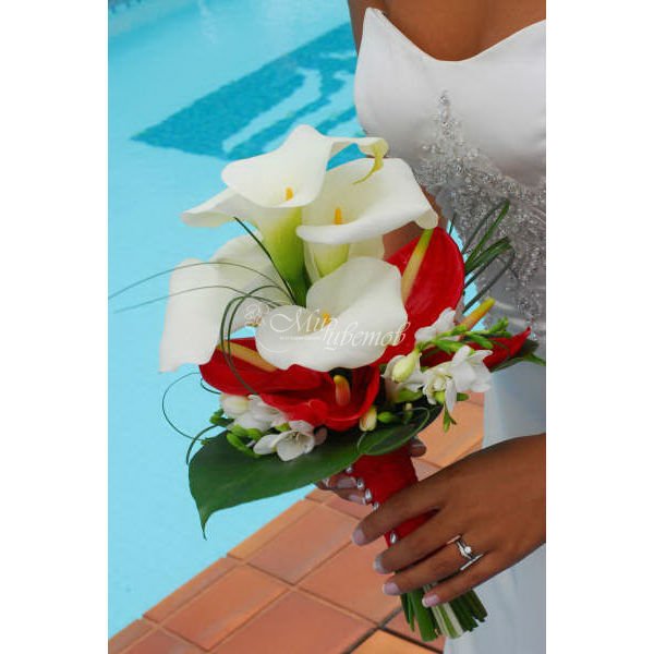 Антуриум алый Каллы белый Фрезия белая Зелень Аксессуары