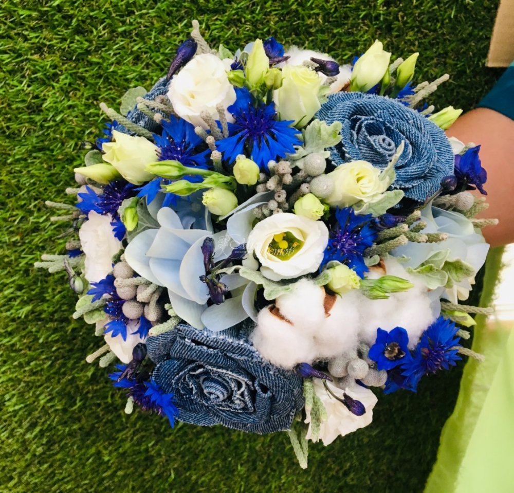 Хлопок Эустома Бруния Ценерария Эвкалипт Васельки Дельфиниум Гортензия Джинсовые розы